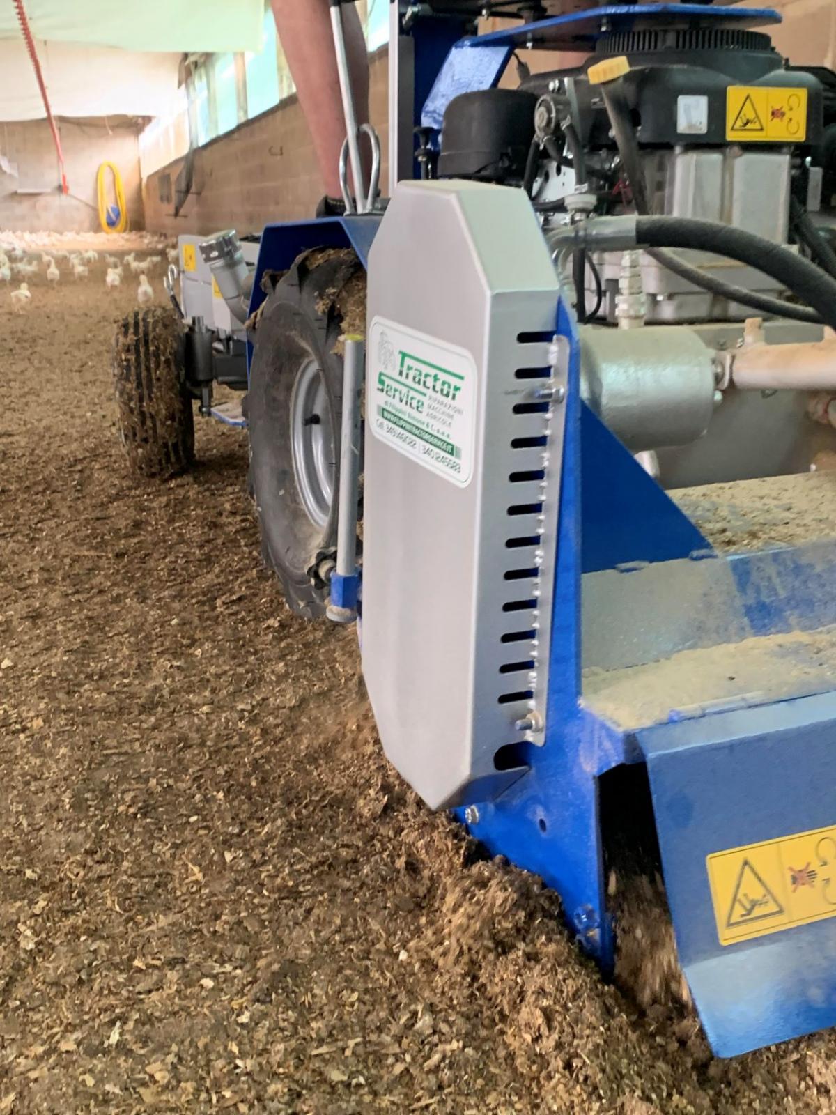 Al posteriore, invece, troviamo una fresa idraulica per la movimentazione della lettiera, con una larghezza di 100 cm dotata di controcoltelli e trasmissione a catena.